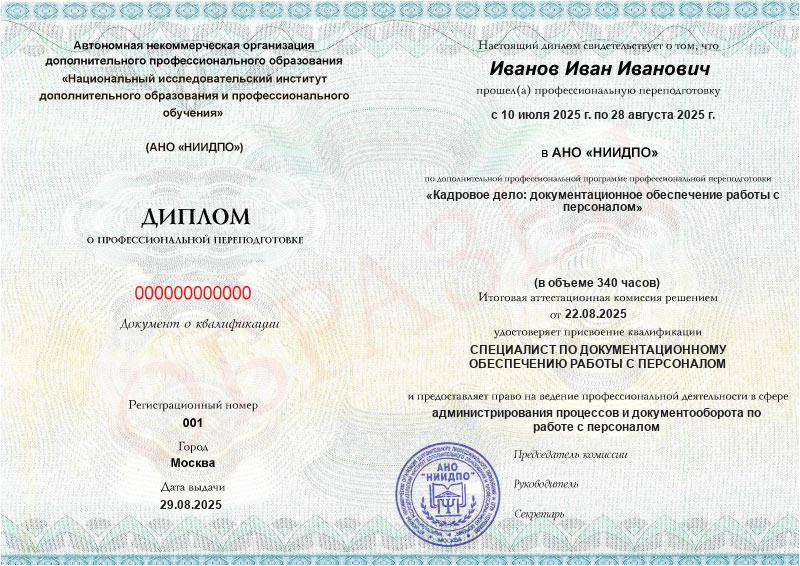 - Диплом о профессиональной переподготовке с квалификацией специалиста по документационному обеспечению работы с персоналом