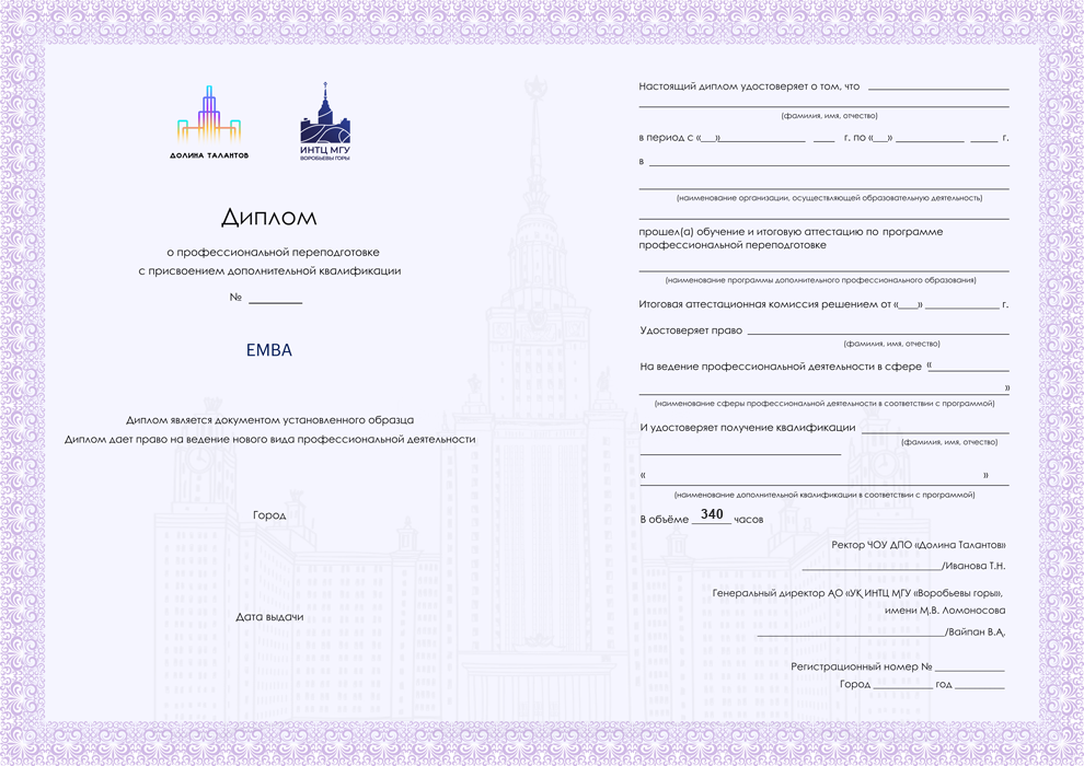 Диплом о профессиональной переподготовке от ИНТЦ МГУ «Воробьевы горы»Диплом действует на территории всей России и признается государственными и частными организациями