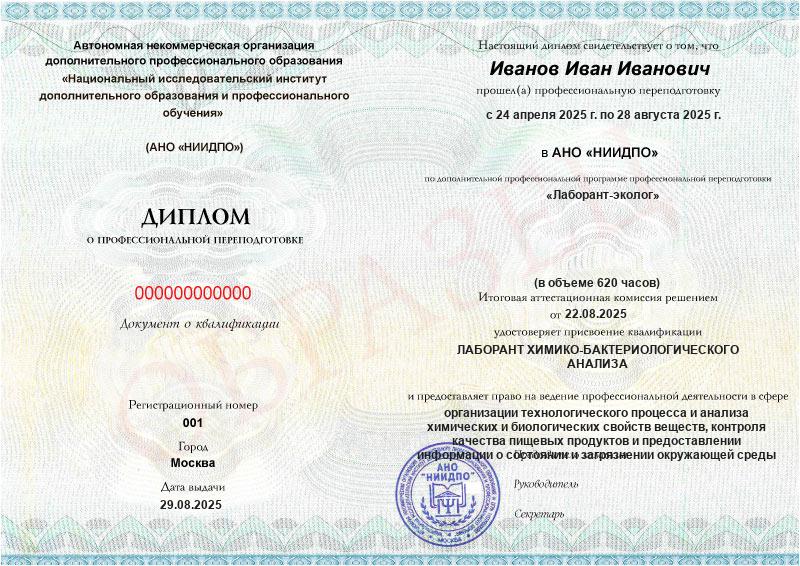 Учебный план программы профессиональной переподготовки «Лаборант-эколог» с присвоением квалификации «Лаборант химико-бактериологического анализа»