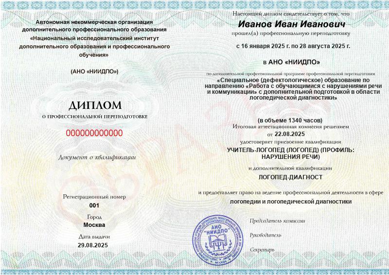 • 2 квалификации: Учитель-логопед (логопед) (профиль: нарушения речи) + Логопед-диагност