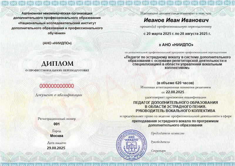 • 2 квалификации: Педагог дополнительного образования в области эстрадного пения. Руководитель вокального коллектива + Репетитор по вокалу