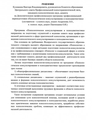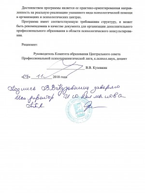 Программа рецензирована руководителем Комитета образования Центрального совета Профессиональной психотерапевтической лиги, кандидатом психологических наук, доцентом, Кузовкиным В.В.