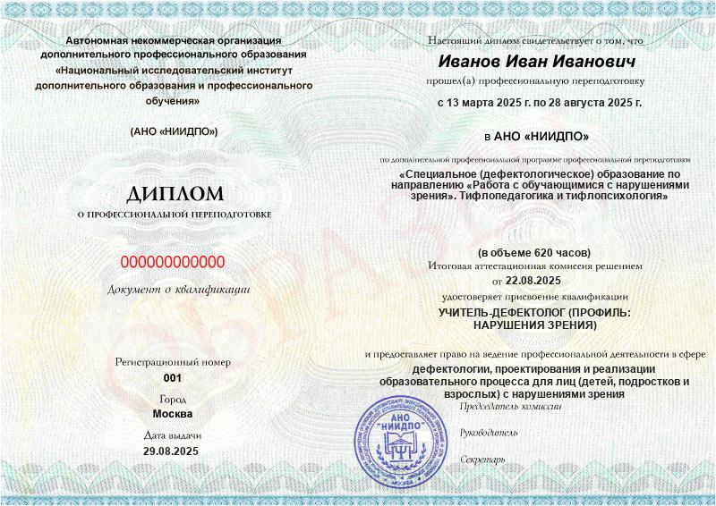 • Квалификация: Учитель-дефектолог (профиль: нарушения зрения)
