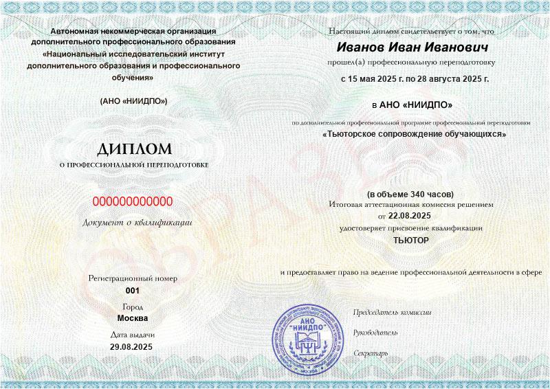 Студент, желающий поступить в АНО «НИИДПО», должен предоставить справку из образовательной организации. Независимо от срока окончания обучения по программе дополнительного образования, диплом о профпереподготовке выдаётся только после предъявления документа о получении среднего профессионального или высшего образования.