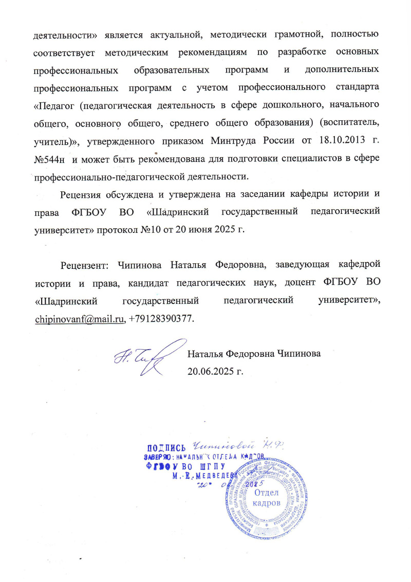 Читайте рецензию заведующей кафедрой истории и права ФГБОУ ВО «Шадринский государственный педагогический университет», кандидата педагогических наук, доцента Чипиновой Н.Ф.