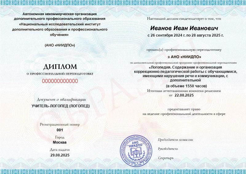 Диплом о профессиональной переподготовке с двумя квалификациями «Учитель-логопед (логопед)», «Учитель-дефектолог».Диплом действует на территории всей России и признается государственными и частными организациями.