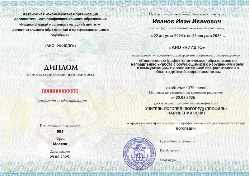Специальное (дефектологическое) образование по направлению «Работа с обучающимися с нарушениями речи и коммуникации» с дополнительной специализацией в области детской нейропсихологии (1370ч)